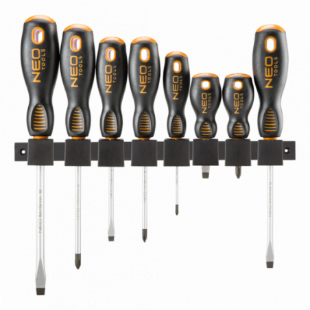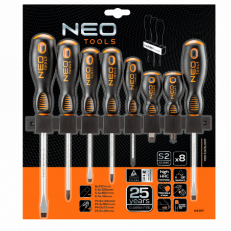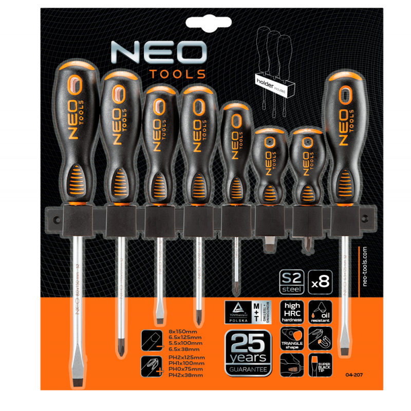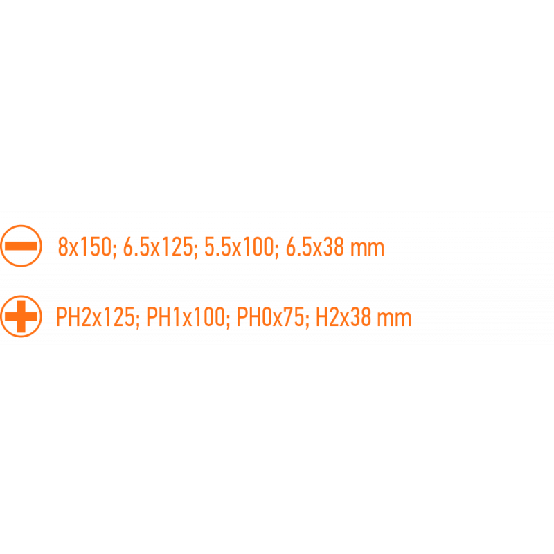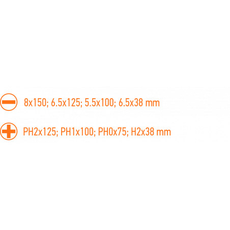 Wkrętaki, zestaw 8 szt., stal S2, magnetyczna końcówka, trójgraniasty kształt uchwytu, wyprofilowane oparcie dla kciuka, uchwyt pokryty tworzywem TPR odpornym na działanie chemikaliów, olejów mineralnych, smarów, rozmiary: płaskie 8x150 mm, 6x125 mm, 5x100 mm, 6x38 mm, krzyżowe PH2x125 mm, PH1x100 mm, PH0x75 mm, PH2x38 mm, wieszak/pudełko