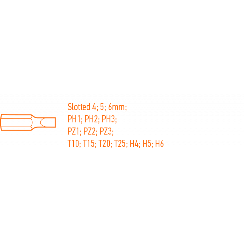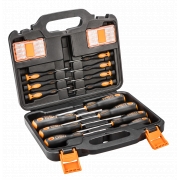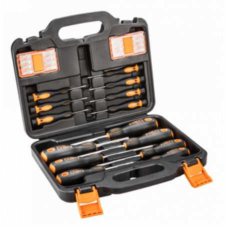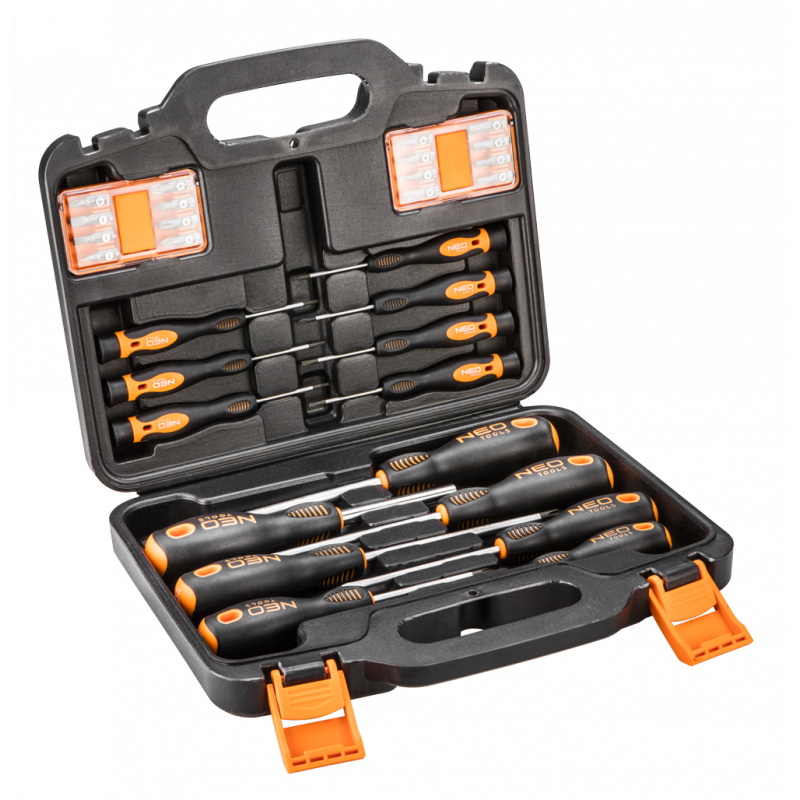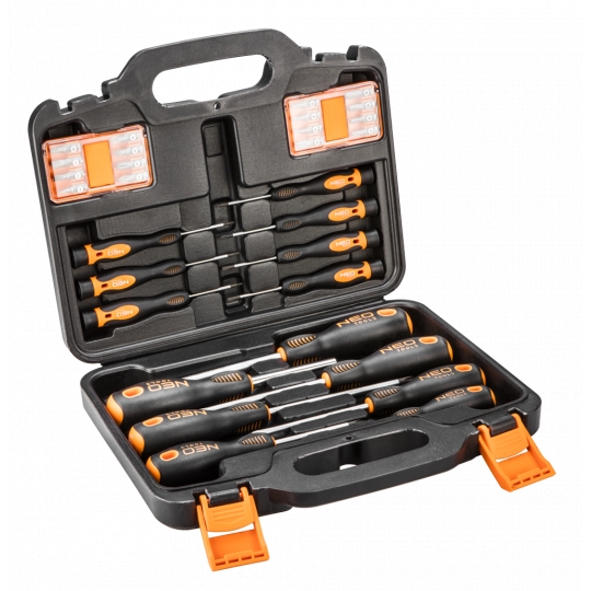 Zestaw wkrętaków i końcówek wkrętakowych NEO, zestaw 30 szt., stal S2, magnetyczna końcówka, trójgraniasty kształt uchwytu, wyprofilowane oparcie dla kciuka, uchwyt pokryty tworzywem TPR odpornym na działanie chemikaliów, olejów mineralnych, smarów, rozmiary: płaskie 8x150 mm, 6x125 mm, 5x100 mm,3x75 mm, 2.5x50 mm, 3.0x50 mm , krzyżowe PH2x125 mm, PH1x75 mm,PH00x50 mm, PH0x50 mm, Torx T6x50 mm, T7x50 mm, T8x50 mm, uchwyt do bitów, 16 bitów 4 mm, 5 mm, 6 mm, PH1, PH2, PH3, PZ1, PZ2, PZ3, T10, T15, T20, T25, H4, H5, H6, walizka