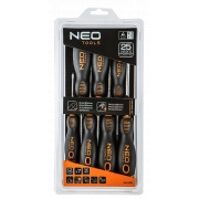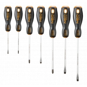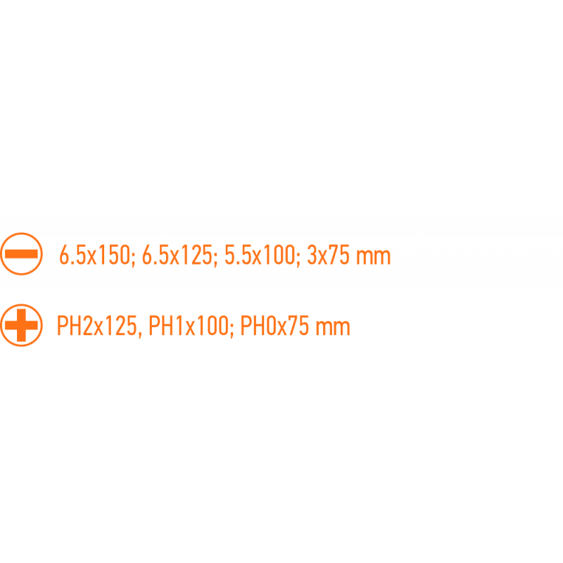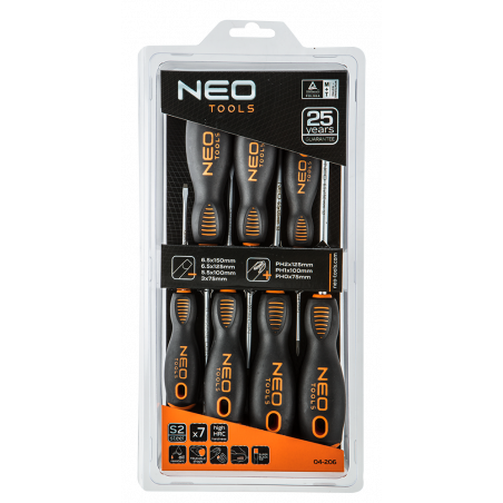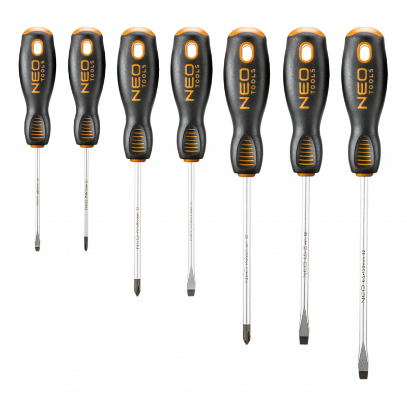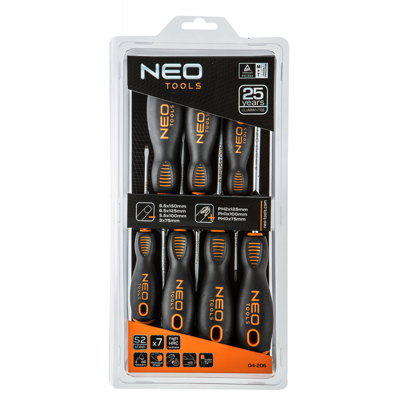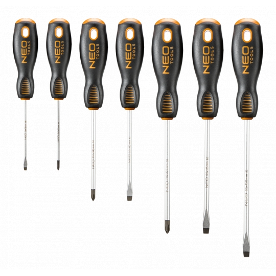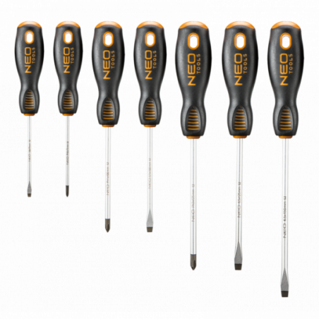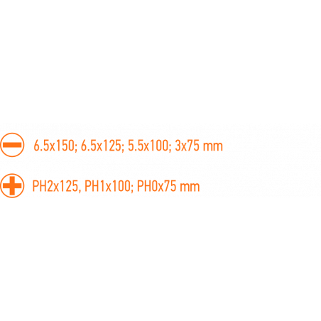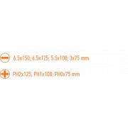 Wkrętaki, zestaw 7 szt., stal S2, magnetyczna końcówka, trójgraniasty kształt uchwytu, wyprofilowane oparcie dla kciuka, uchwyt pokryty tworzywem TPR odpornym na działanie chemikaliów, olejów mineralnych, smarów, rozmiary: płaskie 6x150 mm, 6x125 mm, 5x100 mm, 3x75 mm, krzyżowe PH2x125 mm, PH1x100 mm, PH0x75 mm