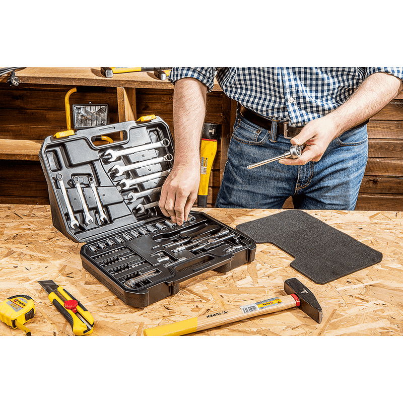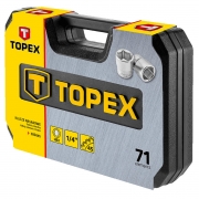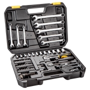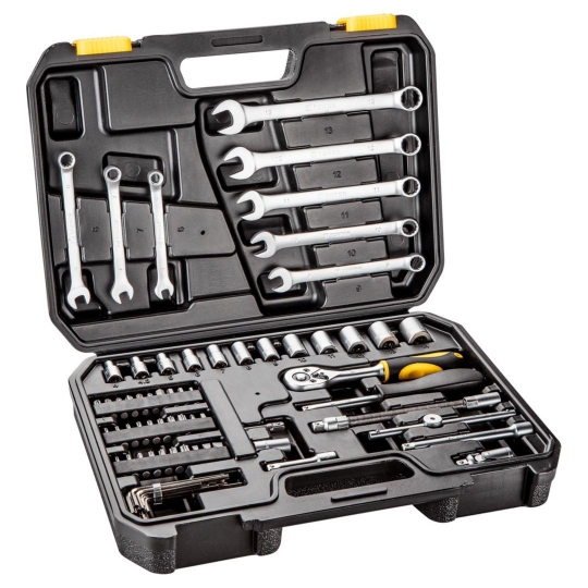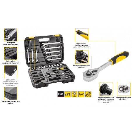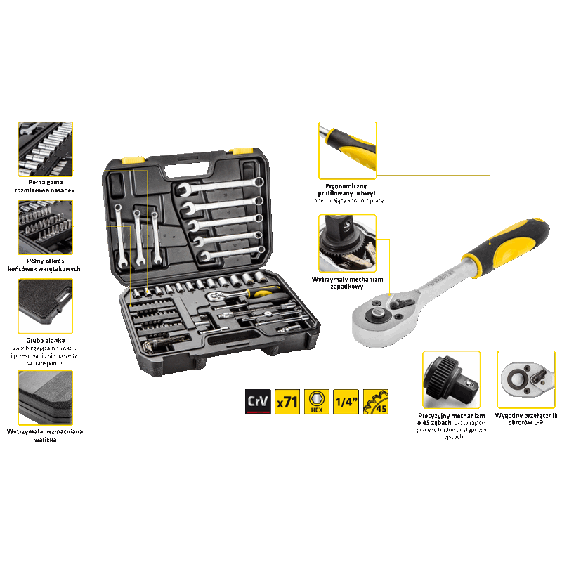 Klucze nasadowe 71 szt., 1/4", bity 1/4", 30 szt.: T8, T9, T10, T15, T20, T25, T30, T40, TT8, TT10, TT15, TT20, TT25, TT30, TT40, H3, H4, H5, H6, PH1, PH2, PH3, PZ1, PZ2, PZ3, SL4, SL5.5, SL7, S1, S2; nasadki 1/4" 12 szt.: 4, 4.5, 5, 6, 7, 8, 9, 10, 11, 12, 13, 14 mm, klucze sześciokątne 12 szt.: 1.27 x 2 szt., 1.5 x 2 szt., 2.0 x 2 szt., 2.5 mm, 3.0 x 2 szt., 4.0 x 2 szt., 5.0 mm; klucz płasko-oczkowy 8 szt.: 6, 7, 8, 9, 10, 11, 12, 13 mm; przedłużka 1/4" 2 szt. 50 mm i 100 mm, przedłużka elastyczna 1/4", grzechotka 1/4" 45T, pokrętło typu T 1/4", uchwyt do bitów 1/4", przegub uniwersalny 1/4", adapter do wkrętarki, adapter do bitów.