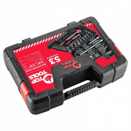 Zestaw kluczy nasadowych 1/4", 1/2" 53 szt. Materiał – stal węglowa. Grzechotka ½”, grzechotka ¼”, uchwyt wkrętakowy ¼”, uchwyt wkrętakowy typu T ¼”, przedłużka ¼” – 75mm, przedłużka ½” – 110mm, przedłużka ½” – 250 mm, uchwyt do bitów ¼”, adapter do wkrętaki na bity ¼”, adapter do wkrętaki na nasadki ¼”, nasadki ½” 13 szt.: 10, 11, 12, 13, 14, 15, 16, 17, 19, 22, 24, 27, 30 mm; nasadki ¼”, 9 szt.: 4, 5, 6, 7, 8, 9, 10, 11, 13 mm, klucze HEX 7 szt.: 1.5, 2, 2.5, 3, 4, 5, 6 mm; końcówki wkrętakowe 25 mm, 14 szt.: H3, H4, H5, H6, T10, T15, T20, SL4, SL5, SL6, PH1, PH2, PZ1, PZ2.