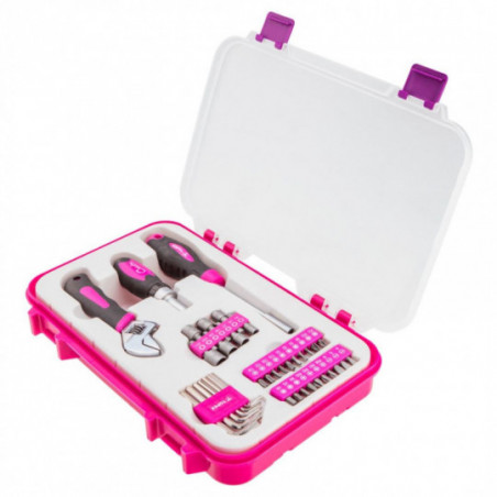 Zestaw narzędziowy dla kobiet TOPEX Creator 37 szt. zawierający: klucz nastawny 145mm, uchwyt do bitów z grzechotką, wkrętak magnetyczny z gniazdem do bitów 210mm, nasadki sześciokątne na trzpieniu: 5mm, 6mm, 7mm, 8mm, 9mm, 10mm, 11mm, klucze imbusowe: 1.5mm, 2mm, 2.5mm, 3mm, 4mm, 5mm, 6mm, bity: SL4, SL5, SL6, PH0, PH1, PH2, PH3, H4, H5, H6, PZ1, PZ2, S0, S1, S2, S3, T15, T20, T27, T30.