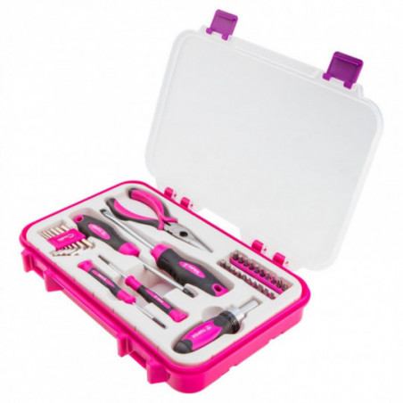 Zestaw narzędziowy dla kobiet TOPEX Creator 33 szt. zawierający: szczypce wydłużone proste 160mm, wkrętak PH2x100mm, wkrętak SL6.5x100mm, uchwyt do bitów z grzechotką, wkrętak precyzyjny SL2.0, wkrętak precyzyjny PH2.0, klucze imbusowe : 1.5mm, 2mm, 2.5mm, 3mm, 4mm, 5mm, 6mm, bity: SL4, SL5, SL6, PH0, PH1, PH2, PH3, H4, H5, H6, PZ1, PZ2, S0, S1, S2, S3, T15, T20, T27, T30.