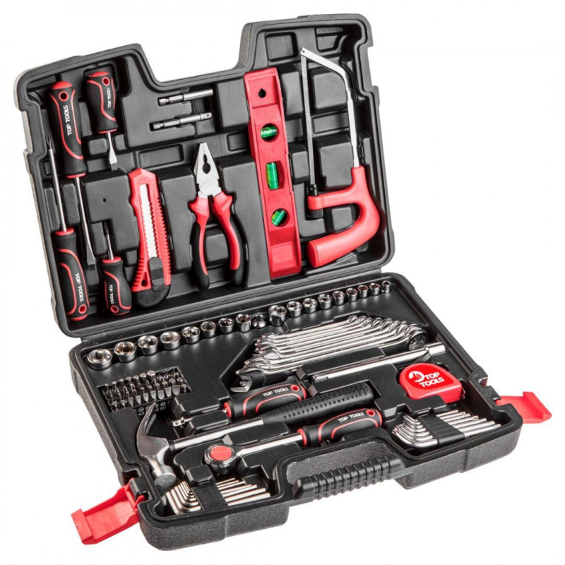 Zestaw narzędziowy Top Tools (nr. ref. 38D535). Materiał: stal węglowa. Piła do metalu 150 mm, brzeszczoty do piły 150 mm – 4 szt., młotek stolarski 200g, szczypce uniwersalne, grzechotka 3/8”, nasadki sześciokątne 3/8” 8 szt.: 10, 12, 13, 14, 15, 16, 17, 19 mm; przedłużka 3/8” 150 mm; uchwyt wkrętakowy ¼”; adapter ¼”M x 3/8”F; nasadki ¼” 9 szt.: 6, 7, 8, 9, 10, 11, 12, 13, 14 mm; nóż składany z ostrzem 18 mm; klucze sześciokątne z uchwytem 7 szt.: 1.5, 2, 2.5, 3, 4, 5, 6 mm; klucze TORX z uchwytem 7 szt.: T10, T15, T20, T25, T27, T30, T40; klucze płasko-oczkowe 9 szt.: 8, 10, 11, 12, 13, 14, 16, 17, 19 mm; wkrętaki 190 mm 2 szt.: PH2, SL 6.5 mm; wkrętaki 83 mm 2 szt.: PH2, SL 6.5 mm; adaptery do wkrętarki 2 szt., taśma miernicza 2m; poziomnica, końcówki wkrętakowe 40 szt.