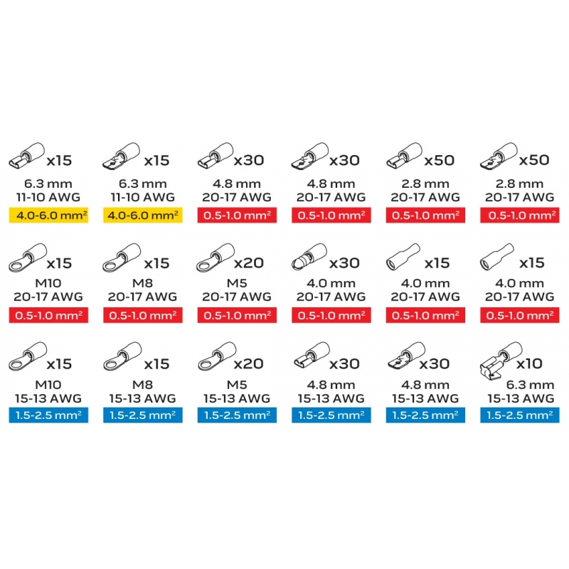 Zestaw konektorów elektrycznych Neo (nr ref. 01-535) 420 elementów, plastikowe pudełko, materiał konektorów aluminium, na przewód 1.5-2mm2 - 15szt. M10, 15szt. M8, 20szt. M5, nasuwki 30szt. 4.8mm, wsuwki 30szt. 4.8mm, wsuwko-nasuwki 10szt. 6.3mm, na przewód 0,5-1.0mm2 15szt. M10, 15szt. M8, 20szt. M5, wsuwki 30szt. 4.8mm, 50szt. 2.8mm, wsuwki 30szt. 2.8mm, 50szt. 2.8mm, cylindryczne 30szt. 4.0mm, łącznik 30szt. 4.0mm, na przewód 4.0-6.0mm2 nasuwki 15szt. 6.3mm, wsuwki 15szt. 6.3mm.