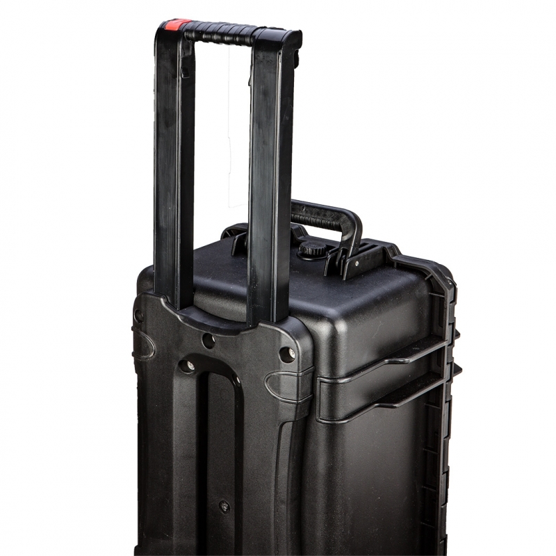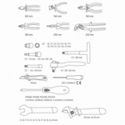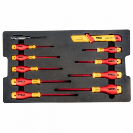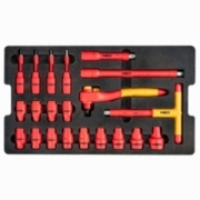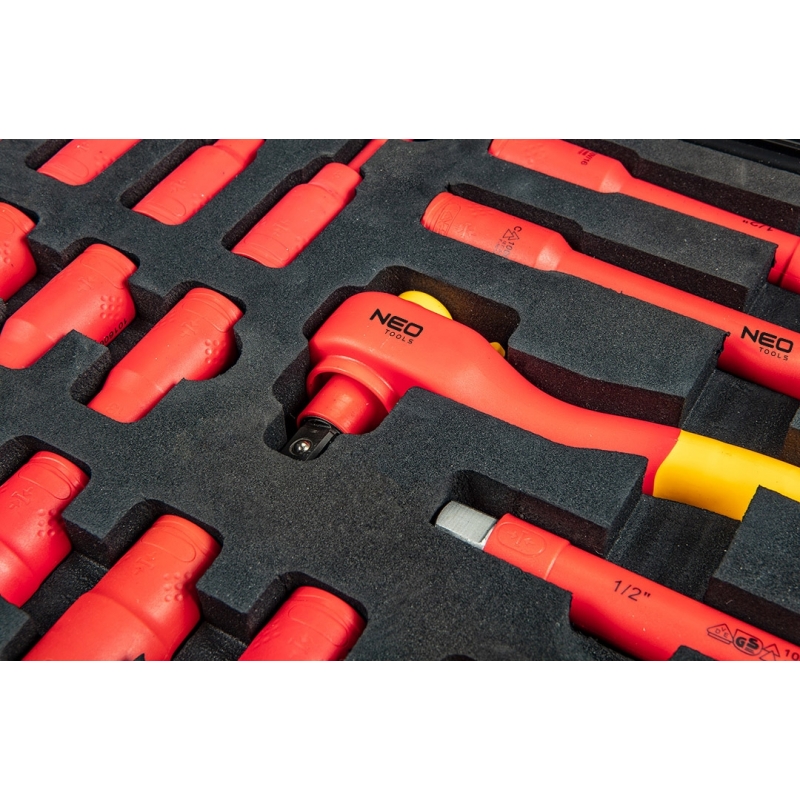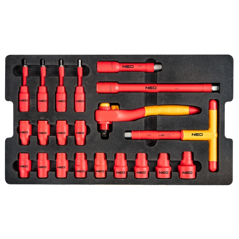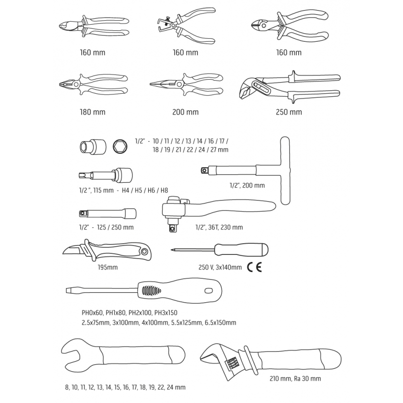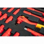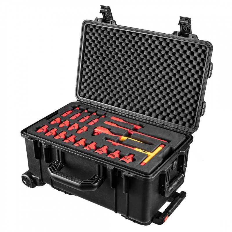 Skrzynia serwisowa elektryka (01-311) materiał skrzyni polipropylen, trzy uchwyty w tym jeden teleskopowy z blokadą, koła, zawór ciśnieniowy, gumowa uszczelka, mocne zatrzaski, wkłady piankowe z miejscem na dłoń, narzędzia 1000 V: Szczypce uniwersalne 180 mm, szczypce wydłużone proste 200 mm, szczypce boczne 160 mm, szczypce do rur 250 mm, obcinak do kabli 160 mm, ściągacz izolacji 160 mm, wkrętaki PH0x60, PH1x80, PH2x100, PH3x150 mm, SL 2,5x75 mm, 3x100 mm, 4x100 mm, 5.5x125 mm, 6.5x150 mm, próbnik elektryczny 250 V, nóż 190 mm, klucze płaskie 8, 10, 11, 12, 13, 14, 15, 16, 17, 18, 19, 22, 24 mm, klucz nastawny 210 mm, klucze nasadowe 10, 11, 12, 13, 14, 16, 17, 18, 19, 21, 22, 24, 27 mm, przedłużki 125 i 250 mm, pokrętło T 190 mm, grzechotka 230 mm (36 zębów), nasadki hex 4, 5, 6, 8 mm.