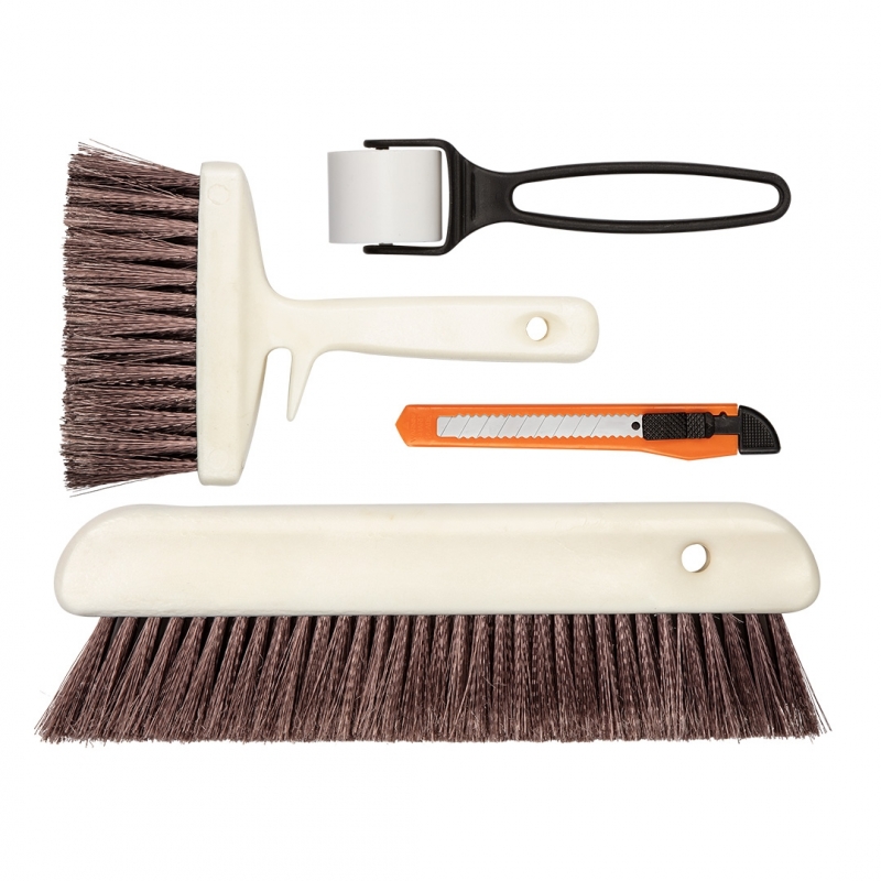 Zestaw do tapetowania 4 szt. nóż z ostrzem łamanym 9mm, plastikowy, blokada ostrza, pędzel łakowiec 7", plastikowy, rolka dociskowa, szczotka dociskowa 5", plastikowa
