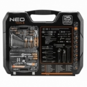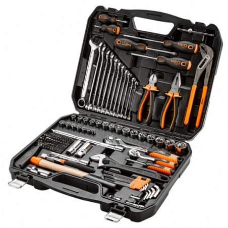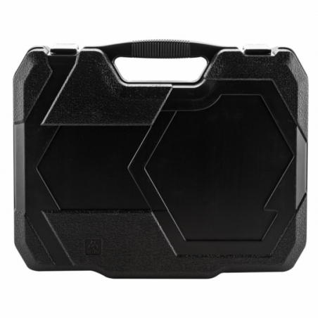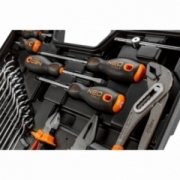 Zestaw narzędzi 143 szt.: grzechotki 2 szt. rozmiar 1/2”, 1/4”; nasadki krótkie rozmiar 1/2" 15szt. : 10,11,12,13,14,15,16,17,18,19,20,21,22,24,27mm; rozmiar 1/4" 7 szt.: 8,9,10,11,12,13,14; przedłużka 2 szt. rozmiar 1/2" : 125 mm, 250 mm, rozmiar 1/4": 50 mm; przegub 1/2", 1/4"; nasadki do świec: 16 , 21 mm; bity 1/4" 76 szt.; Ppokrętło 1/4"; wkrętak do nasadek 1/4"; redukcja do bitów 1/4" x HEX 1/4"; klucze płasko oczkowe 12 szt.: 8,9,10,11,12,13,14,15,16,17,18,19 mm; klucze HEX 9 szt.: 1.5, 2, 2.5, 3, 4, 5, 6, 8, 10 mm; wkrętaki płaskie FD5x38mm, FD6x100mm; wkrętaki PH1x38mm, PH2x100mm, PH2x150mm; szczypce uniwersalne 160 mm; szczypce boczne 160 mm; szczypce do rur 250 mm; młotek 500 g; chwytak magnetyczny 160 - 610 mm; klucz nastawny 300 mm.