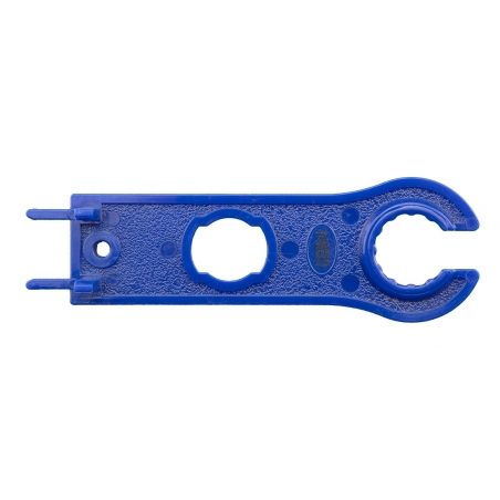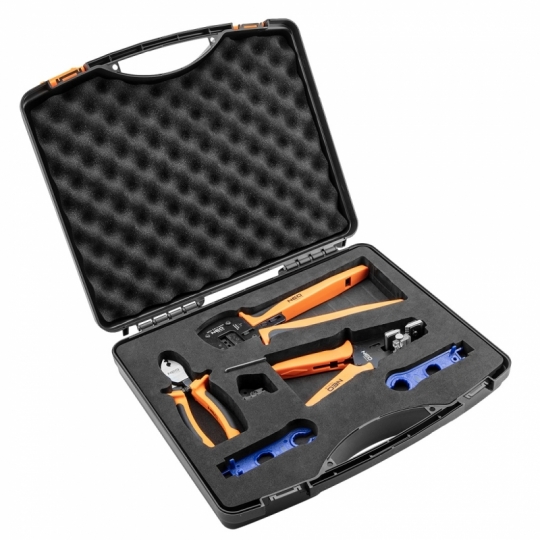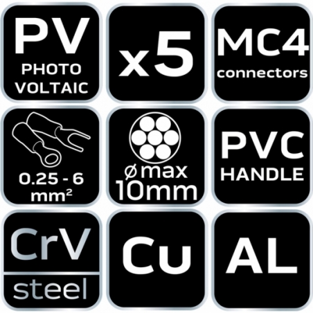 Zestaw narzędzi do fotowoltaiki 5 sztuk, klucze do skręcania korpusów konektorów fotowoltaicznych MC3 i MC4, 2 sztuki materiał sztuczny, długość 118 mm. Ściągacz izolacji przewodów fotowoltaicznych długość 220 mm, uchwyt PVC, stal węglowa, średnice przewodów 0,25mm2 - 6,0 mm2, dwukomponentowy uchwyt, ogranicznik długość izolacji. Szczypce do zaciskania konektorów MC4 o przekrojach 2.5, 4.0, 6.0 mm2, mechanizm zapadkowy, pozycjoner, klucz hex. Obcinak do kabli długość 160mm, do przewodów z aluminium i miedzi, uchwyt dwukomponentowy, hartowane szczęki, max średnica cięcią 10mm, stal chromowo wanadowa, TUV.