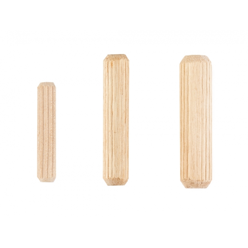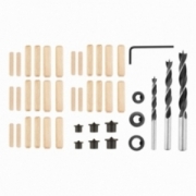 Zestaw do połączeń kołkowych, 43 elementy. 3 średnice akcesoriów 6 mm, 8 mm, 10 mm. W każdym z tych rozmiarów: wiertło do drewna - 1 szt., ogranicznik wiercenia - 1 szt., znaczniki wskazujące miejsce wiercenia - 2 szt., kołki - 10szt. Dodatkowo klucz sześciokątny do ograniczników. Zestaw dedykowany do drewna i materiałów drewnopodobnych