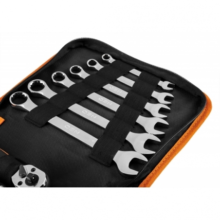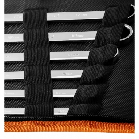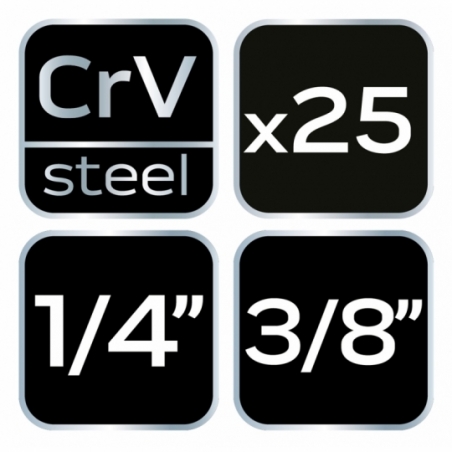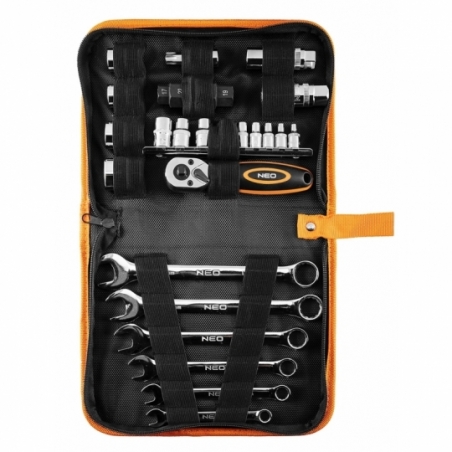 Zestaw narzędzi do motocykla - 25 szt. - miękkie etui, Klucze płasko-oczkowe stal CS 5 szt. rozmiary: 8, 10, 12, 14, 16, 17 mm; nasadki sześciokątne 3/8" 4 szt. rozmiary: 15, 16, 19, 22 mm; nasadki torx 1/4" 5 szt. rozmiary: E4, E5, E6, E7, E8; nasadki torx 3/8" 4 szt. rozmiary: E10, E11, E12, E14; nasadka 3/8" z bitem T55; nadaska do świec 3/8" 2 szt. rozmiary: 14, 16 mm; grzechotka 1/4"&3/8" 72 zęby; narzędzie do osi motocyklowych 4 w 1 rozmiary: 17, 19, 22, 24 mm; miękkie etui;
