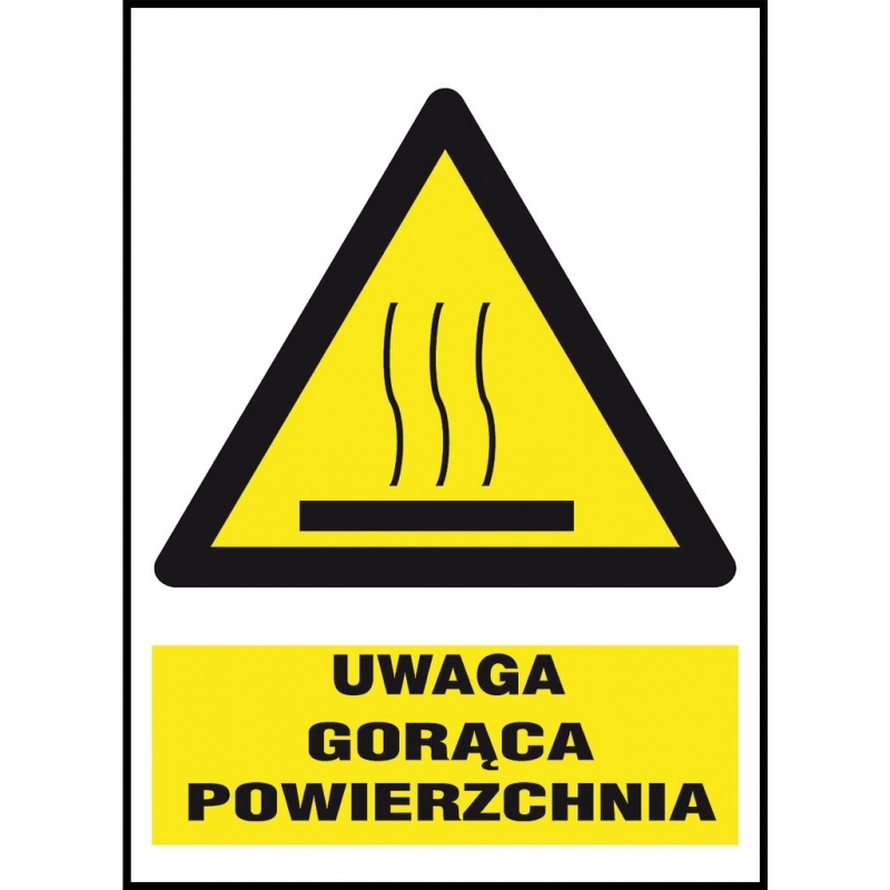 Znak BHP „Uwaga! Gorąca powierzchnia”. - format znaku P w rozmiarze 220x300 - wykonany z: FS - folia samoprzylepna, P - płyta PCV
