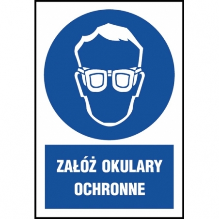 Znak BHP „Załóż okulary ochronne”. - format znaku P w rozmiarze 220x300 - wykonany z: FS - folia samoprzylepna, P - płyta PCV - zgodny z normą PN-93/N-01256/03