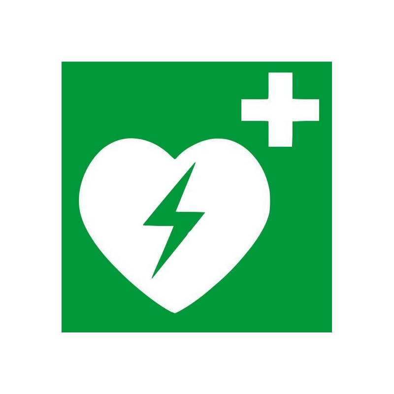 Tablica oznaczeniowa z międzynarodowym znakiem informującym o lokalizacji defibrylatora AED.