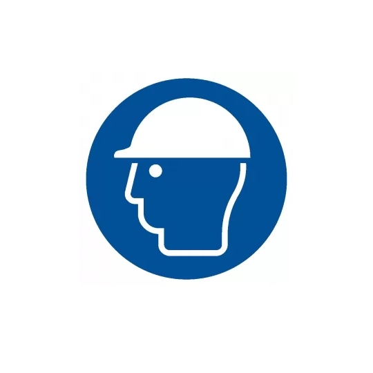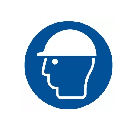 Biały, kwadratowy znak. Na znaku niebieskie koło. Wewnątrz niebieskiego koła biały piktogram - ludzka głowa skierowana w lewo (profil) / zarys głowy; na głowie kask ochronny, hełm / ochrona głowy.