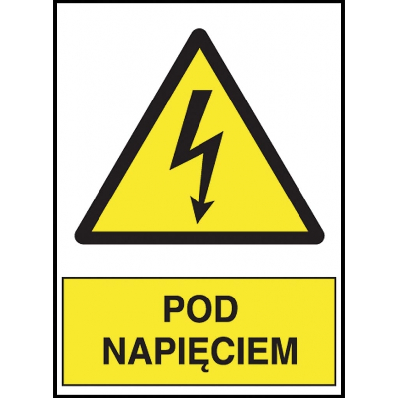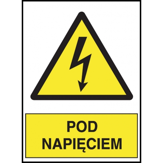 Znak elektryczny „Pod napięciem”. - format znaku Q2 w rozmiarze 74x105 - wykonany z: FS - folia samoprzylepna, P - płyta PCV - zgodny z normą PN-88/E-08501