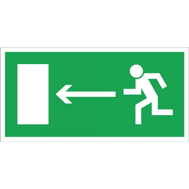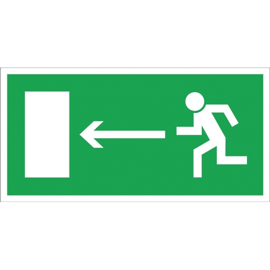 Znak ewakuacyjny „Kierunek do wyjścia drogi ewakuacji w lewo”.