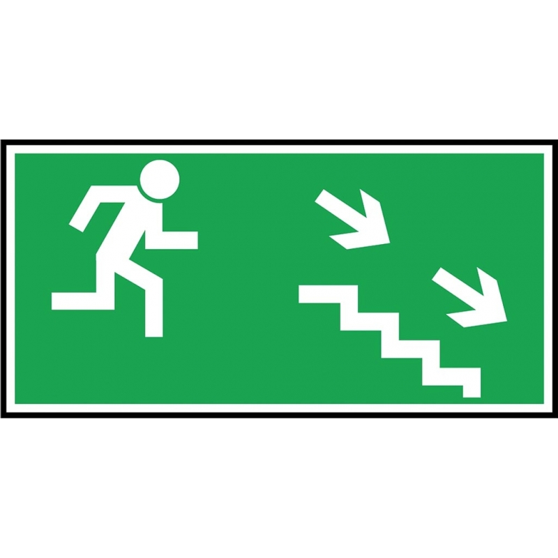 Znak ewakuacyjny „Kierunek do wyjścia drogi ewakuacji schodami w dół w prawo”. - format znaku A w rozmiarze 150x300 - wykonany nadrukiem fotoluminescencyjnym: FS - folia samoprzylepna, LP - płyta LUX samoprzylepna, PT - płyta PCV - wykonany na materiale fotoluminescencyjnym: PL - płyta żółta - posiada Świadectwo Dopuszczenia Centrum Naukowo-Badawczego Ochrony Przeciwpożarowej - zgodny z normą PN92/N-01256/02